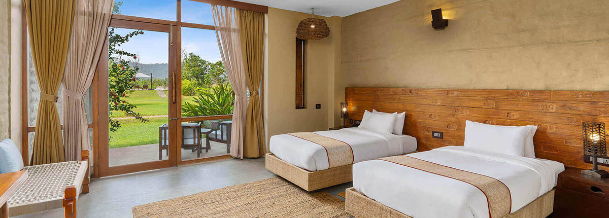 Our Deluxe Rooms offer a bright, welcoming retreat designed in harmony with nature. Finished in warm, earthy tones and furnished with locally crafted details, each room features a double or twin bed and a bathtub – providing comfort after a day of exploration.